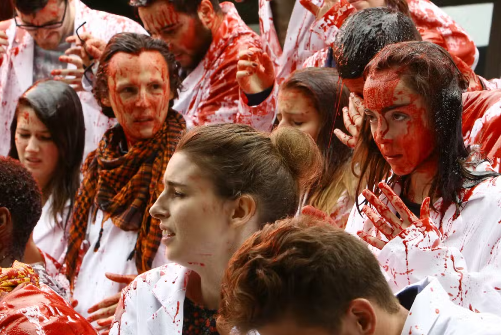 Blood pumps as a neck is slit. Blood gushes from a chewed off limb. We’re promised Murder! Mayhem! Mutilation! and we lap it up like vampires. The stuff on the film set is fake, of course, but not the blood that pounds in those bodies sitting in the movie theater, eyes wide and dark and witnessing, mouths covered in disbelief or open in a scream. Their blood is real.